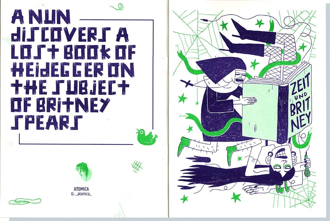 Editor - The zine is made of 17 illustrations by 17 different authors, inspired by a committed tweet, randomly chosen from the "Magic Realism Bot" on Twitter. This Bot is been generating short crazy stories, uninterruptedly, by a decade. Printed in Risograph.