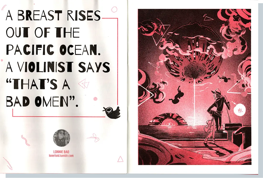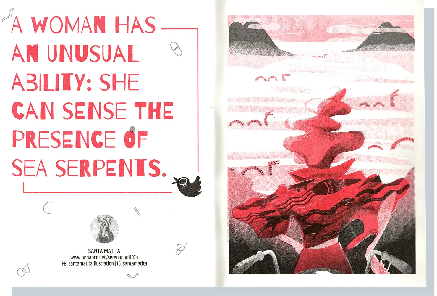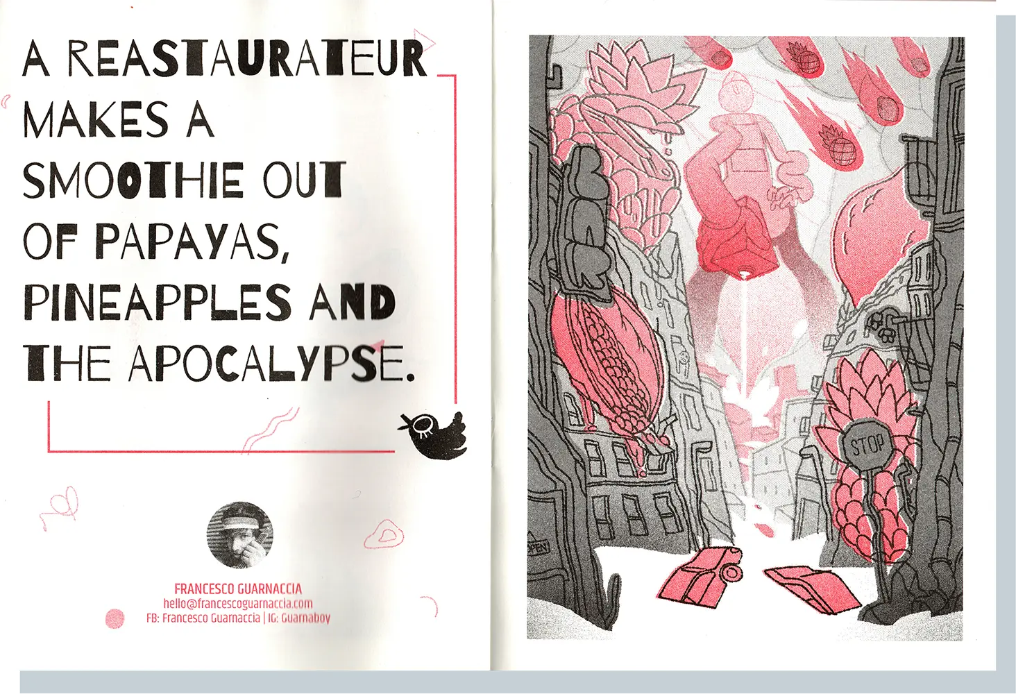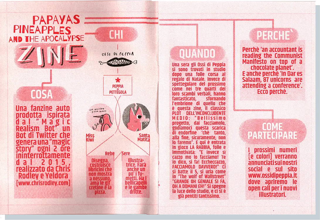 Editor and Illustrator - The zine is made of 17 illustrations by 17 different authors, inspired by a committed tweet, randomly chosen from the "Magic Realism Bot" on Twitter. This Bot is been generating short crazy stories, uninterruptedly, by a decade. Printed in Risograph.